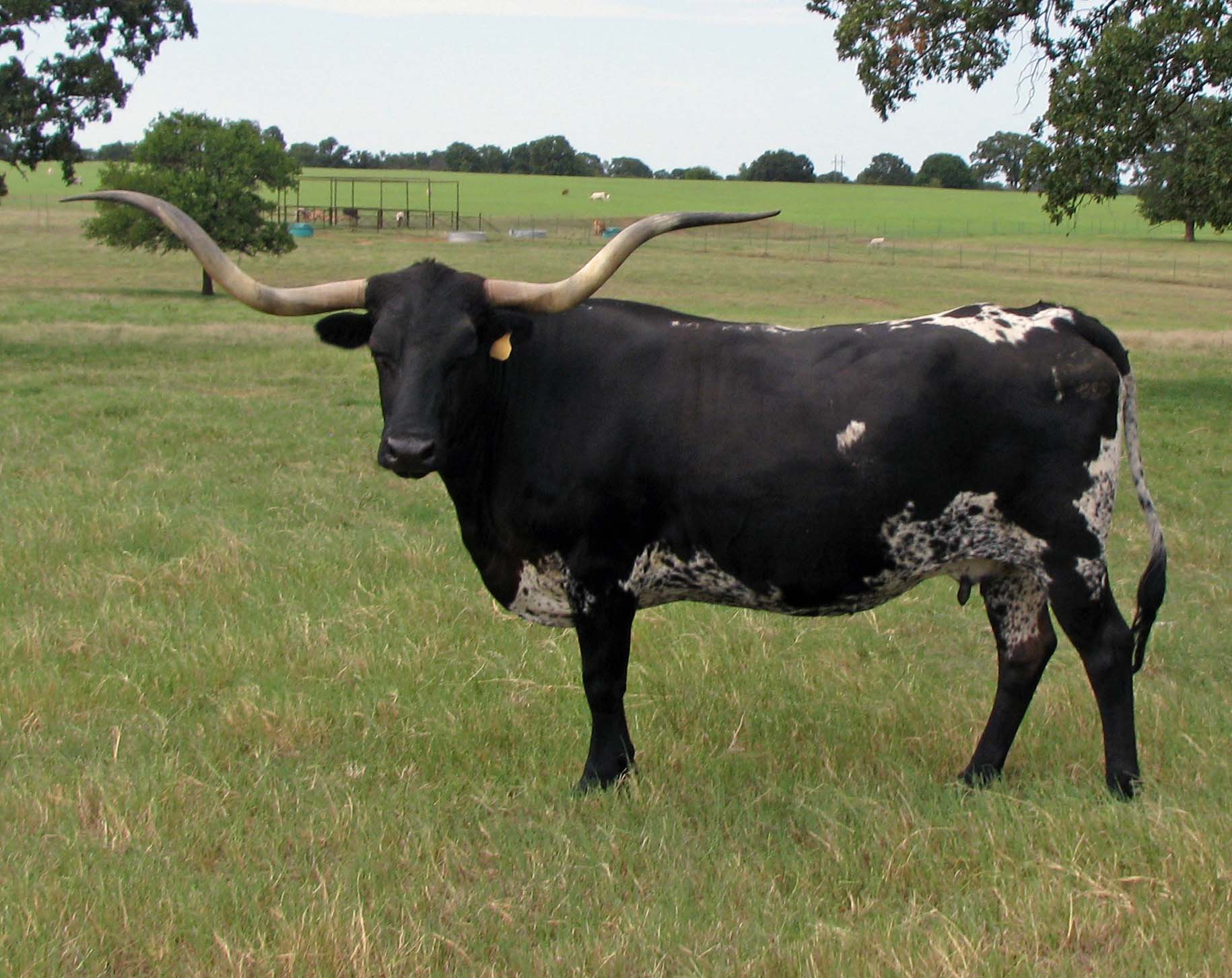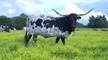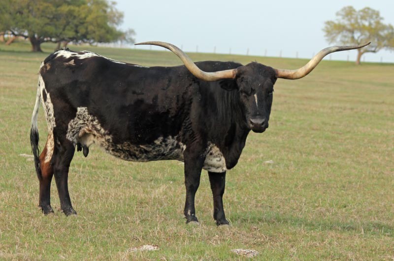 This big, black and white cow is a real standout. Her triple twisty horns are over 78"TTT and 93" of total horn.Her calves are great and she produces a lot of heifers. Her entire pedigree are big horned longhorns.